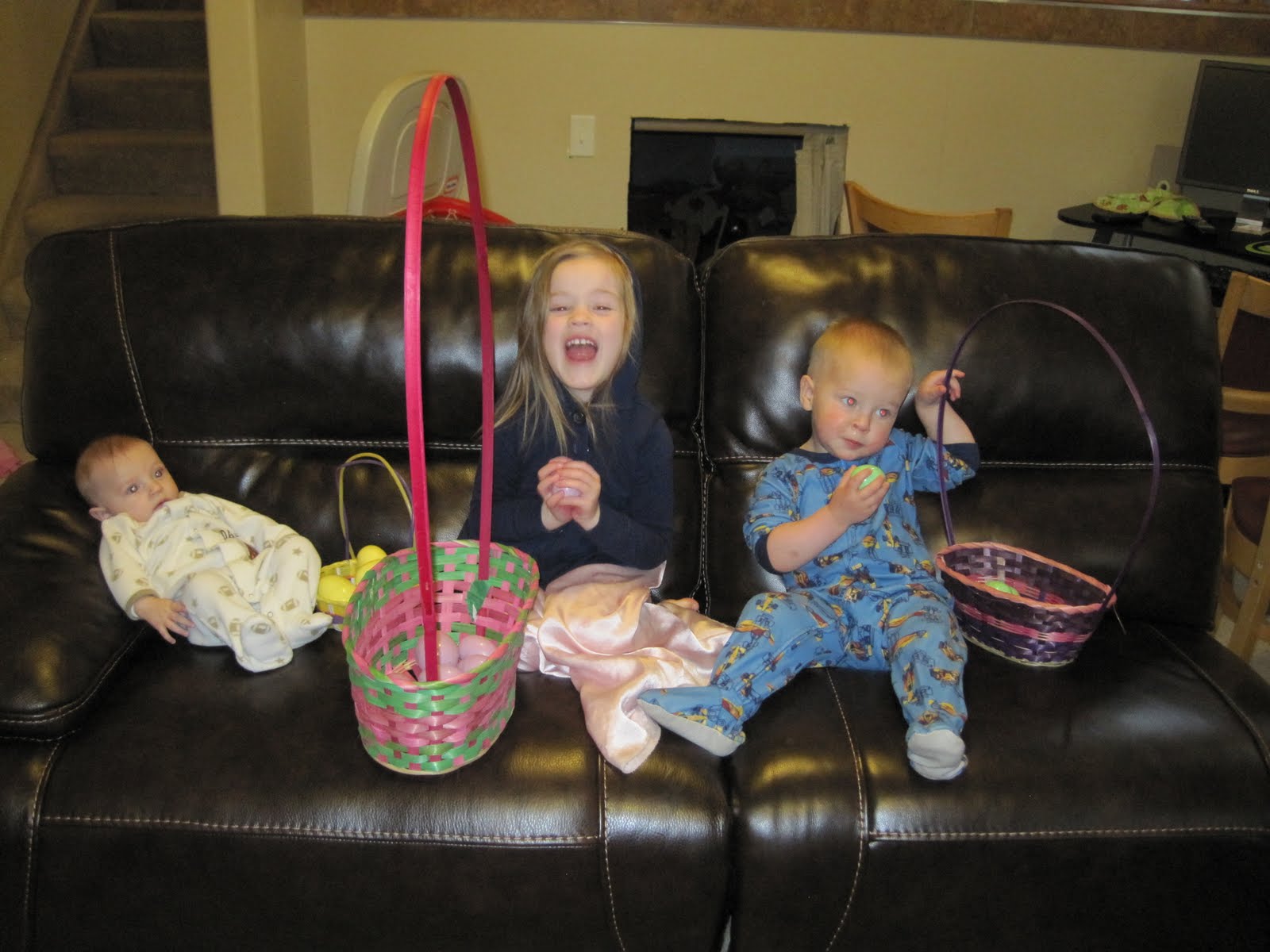 Emma was overly excited to be able to come in and DUMP out all the candy in the eggs. My kids were both limited to 2 pieces of candy, that day, and amazingly there wasn't too many tantrums. Zachary did manage to be sly enough or cute enough to get candy from other cousins or the Aunts and Uncles ... LIKE HE NEEDED IT!!!